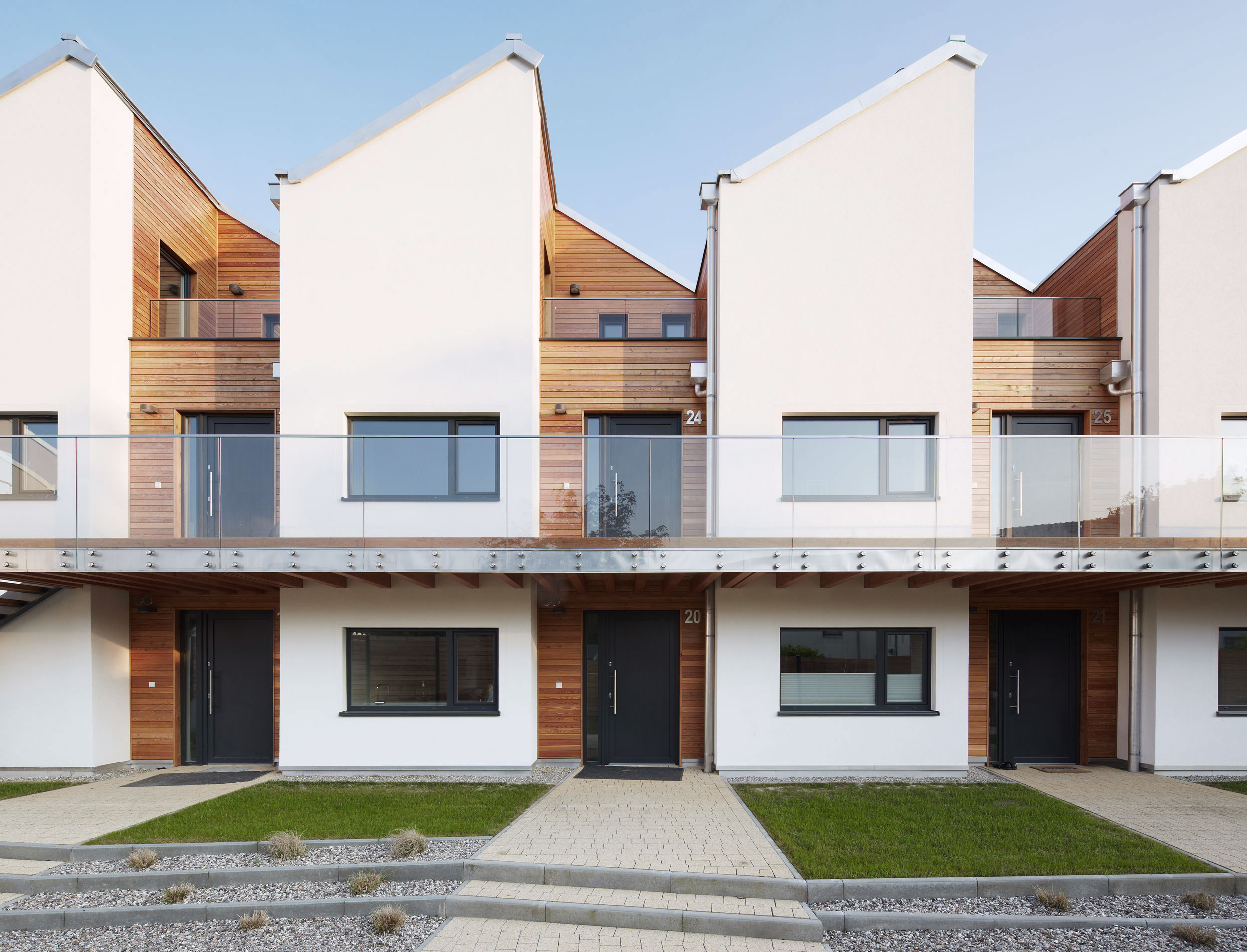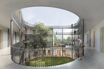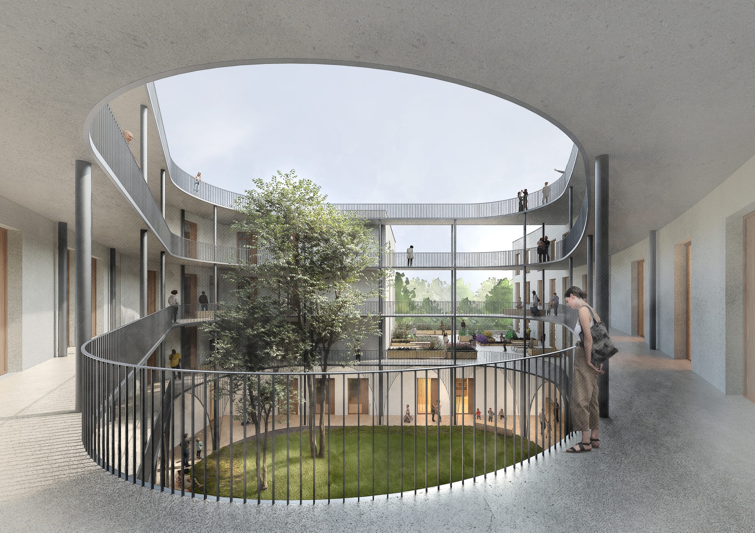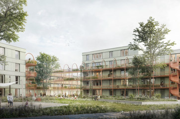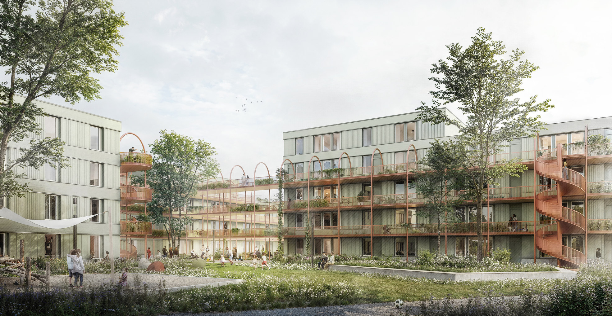 - Maximierte Grünflächen in den Freianlagen, Vielfältige Begrünung der Laubengangstruktur, Gründach zur Förderung der Artenvielfalt und zur Optimierung des Mikroklimas im neuen Quartier